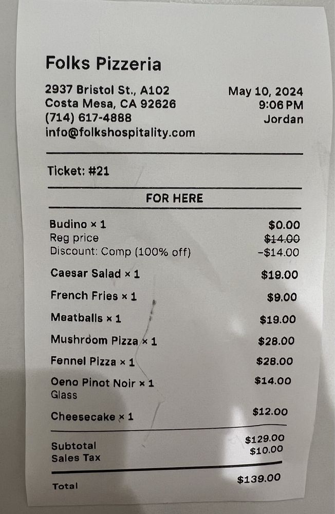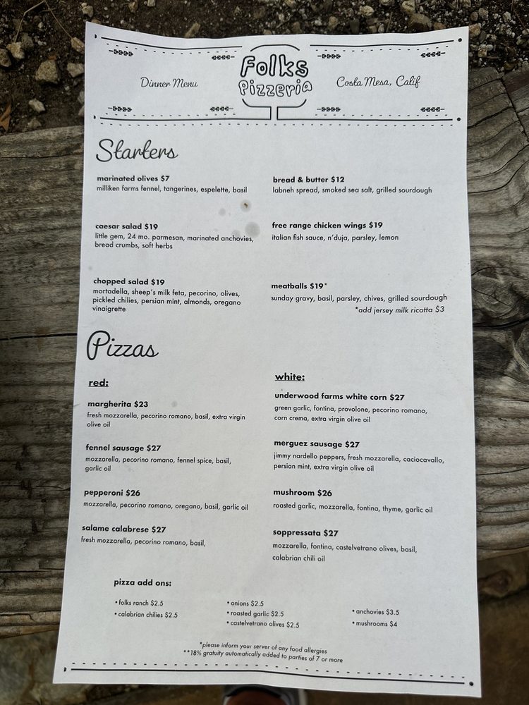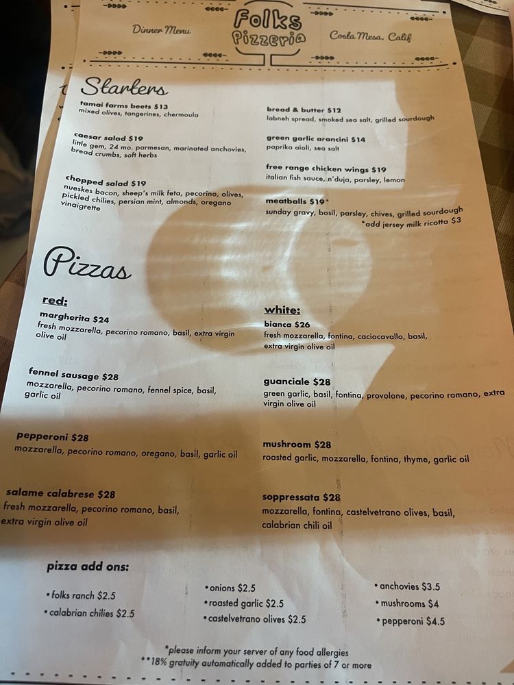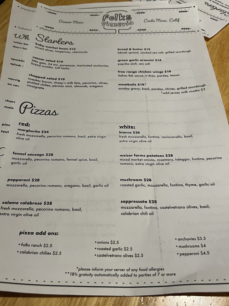 Folks Pizzeria offers a unique dining experience in Costa Mesa, CA, with a focus on delicious pizza and a cozy ambiance. The menu includes a variety of options, from classic pepperoni and mushroom pizzas to more unique choices like the soppressata or fennel sausage pizzas. Customers rave about the fluffy, airy, and bursting-with-flavor crust, as well as the fresh and high-quality ingredients used in each dish. The salads, such as the Caesar salad with crunchy bread crumbs, are also highlighted for their exceptional taste and creativity. Folks Pizzeria is a popular spot, so booking a reservation in advance is recommended. Whether you're looking for a casual dinner or a special date night, Folks Pizzeria is sure to impress with its delectable food and attentive service.